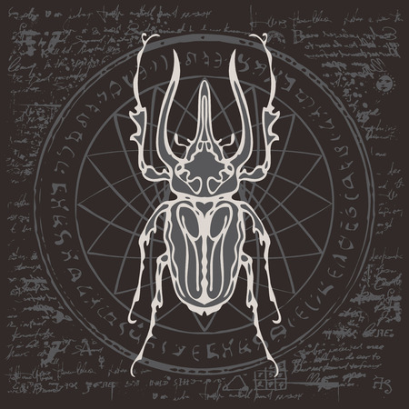 古いパピルスの抽象的な背景にスタッグバグのイラストや スポット 円 星 魔法の碑文やシンボルを持つ原稿 レトロスタイルのベクトルバナー のイラスト素材 ベクタ Image